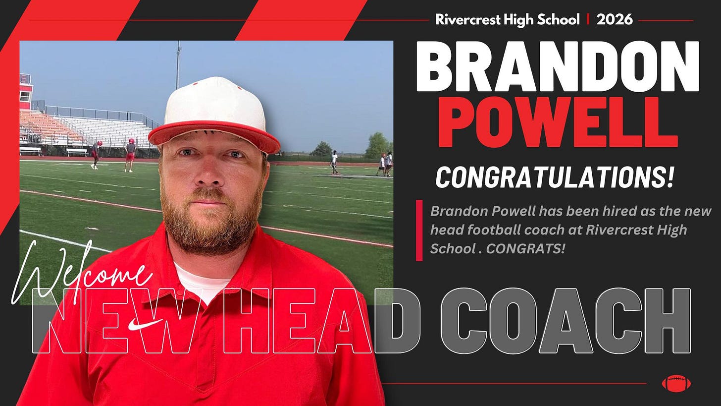 Powell takes over the Rivercrest program following the departure of Johnny Fleming, who stepped down in June 2025 as head football coach and athletic director for health reasons. Brett Hardin has served as interim head coach since Fleming’s resignation.